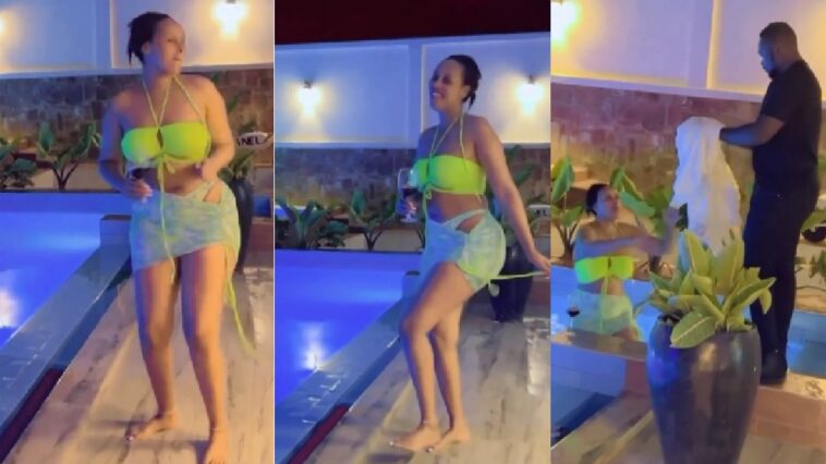 Alliah Cool yasangiye abamukurikira ku rukuta rwe rwa Instagram, amashusho amugaragaza arimo kunywa akadivayi mu kirahure maze ahita ajya muri pisine, akivamo ucunga umutekano we ahita amuha isume yo kwihanaguza.