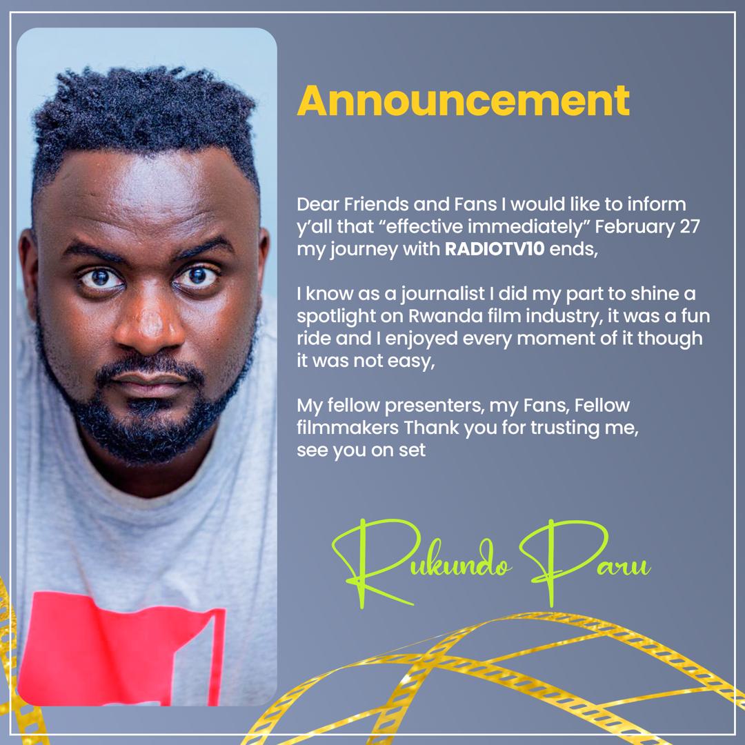 Abinyujije ku rukuta rwe rwa Instagram, Paru yagize ati “Nshuti n’abafana banjye ndashaka kubamenyesha ibyo byose “byihuse ako kanya” 27 Gashyantare urugendo rwanjye na Radio Tv10 rurangiye.