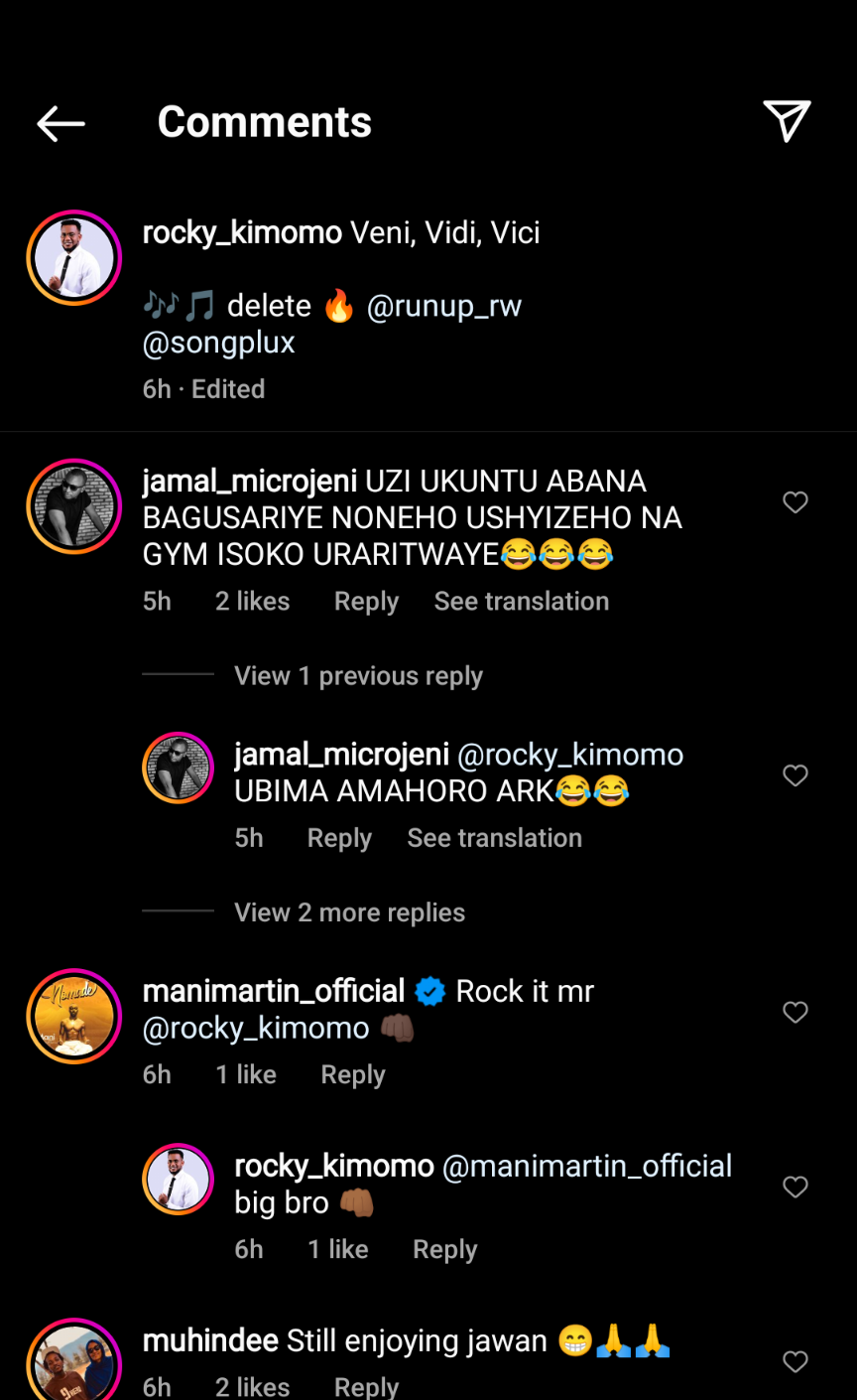 Umusobanuzi wa filime ukunzwe cyane mu Rwanda ndetse uzwiho no gukundwa cyane n’inkumi Rocky Kimomo yifashishije imbuga nkoranyambaga ze yasangije abakunzi be amafoto ari gukorera imyitozo ahazwi nko muri “GYM” maze Jamal Microjeni abibonye yanga kuri pfana agira ati:”Uzi ukuntu abana bagusariye noneho ushyizeho na GYM isoko uraritwaye”.
