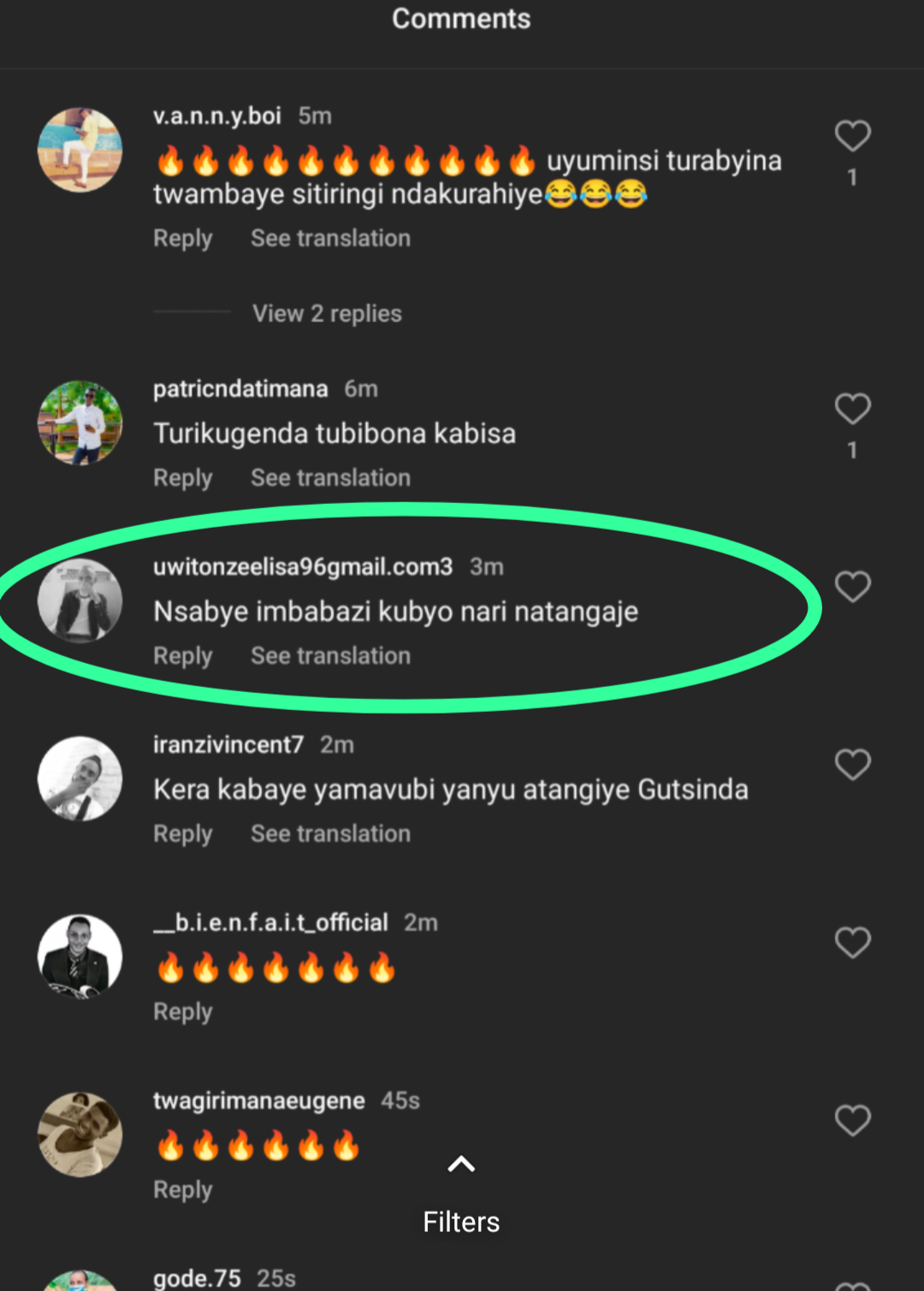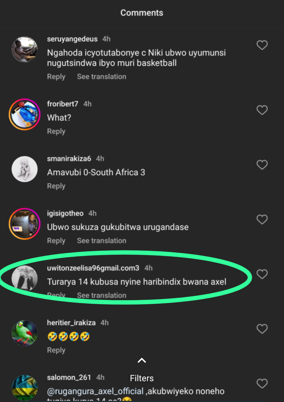 Mbere y’uko umukino utangira hari umuntu witwa Uwitonze Elsa ku rubuga rwa Instagram yatangaje amagambo atari meza ku ikipe y’igihugu Amavubi ” Turarya 14 ku busa hari ibindi se bwana Axel” hari ku ifoto umunyamakuru w’imikino kuri RBA uzwi nka Rugangura Axel yari yashyize ku rukuta rwe rwa Instagram.