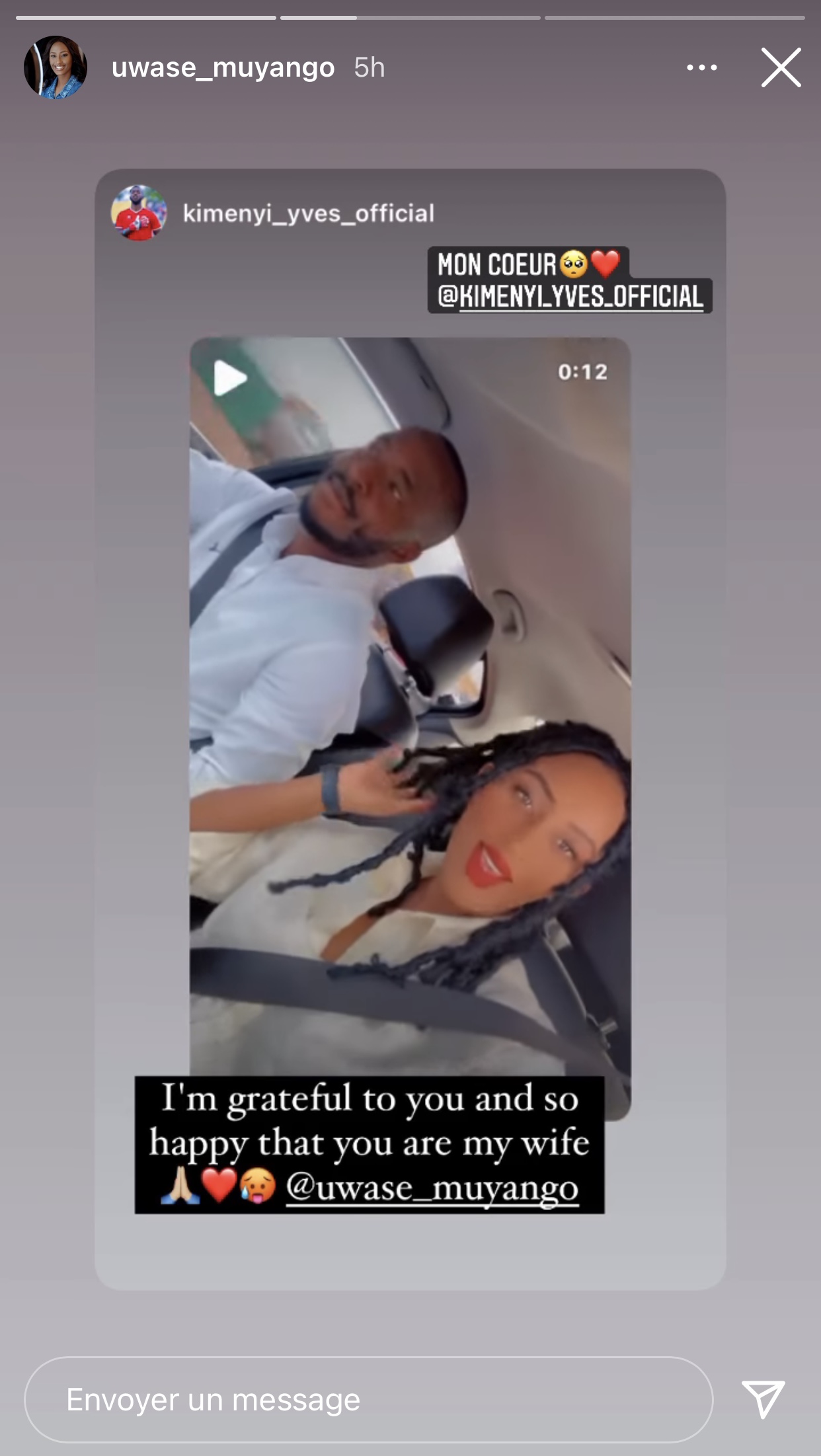 Kimenyu Yves abinyujije kuri story ya instagram ye yasangije abafana be amashusho ye na Miss Muyango aho bari kumwe mu modoka maze ayaherekesha amagambo agira ati « I’m grateful to you and so happy that you are my wife ».