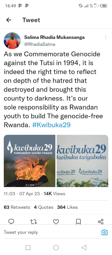 Mu gihe Twibuka Jenoside yakorewe Abatutsi mu 1994, mu byukuri ni igihe gikwiye cyo gutekereza ku bwimbitse bw’inzangano zasenye kandi zizana icyi gihugu mu mwijima. Ni inshingano zacu nk’urubyiruko rw’u Rwanda kubaka u Rwanda rutarangwamo Jenoside”.