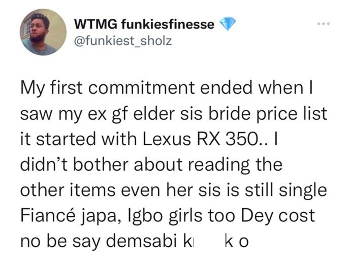 Umusore wo muri Nijeriya yavuze uburyo yahisemo guta umukunzi we biteguraga gukora ubukwe nyuma yo kubona ko igiciro cy’inkwano kizaba gihenze cyane.Uyu musore yavuze ko yafashe umwanya wo kureba k’urutonde rw’inkwano bakoye mukuru we w’umukunzi we abona ari ibintu atashora kubona nibwo yamenye ko agomba guhagarika umubano wabo mu maguru mashya.