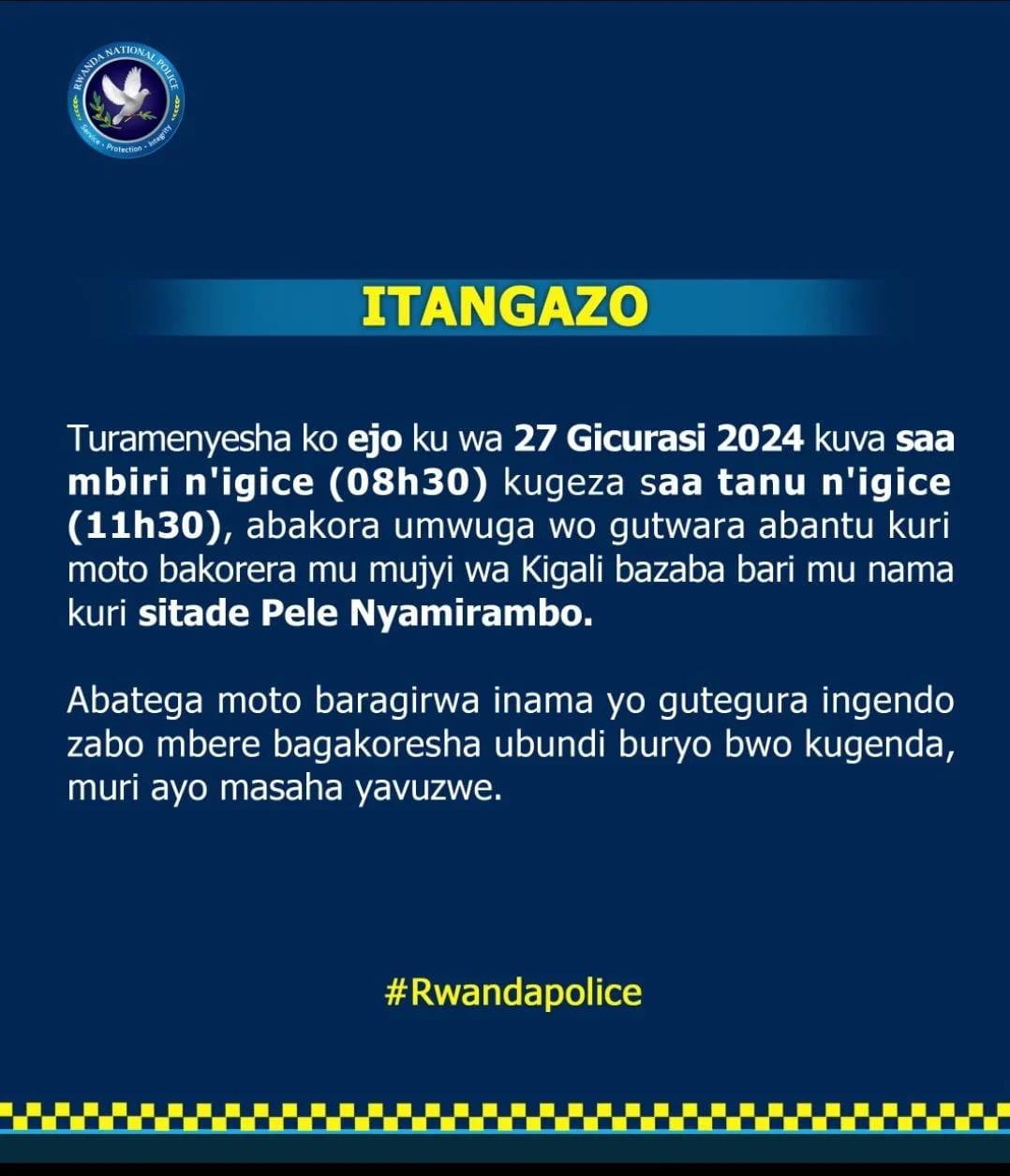 Mu itangazo banyujije ku rubuga rwa X, Polisi yagize iti: “Turamenyesha ko ejo ku wa 27 Gicurasi 2024 kuva saa mbiri n’igice (08h30) kugeza saa tanu n’igice (11h30), abakora umwuga wo gutwara abantu kuri moto bakorera mu mujyi wa Kigali bazaba bari mu nama kuri sitade Pele Nyamirambo.”