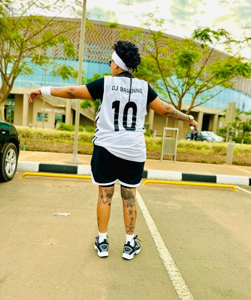 Ntabwo akiri ku rwego rumwe nabo: Dj Brianne yagaragaye yambaye umupira uriho nimero n’amazina yatumye abantu babona ko adashaka kugereranywa na bagenzi be -AMAFOTO