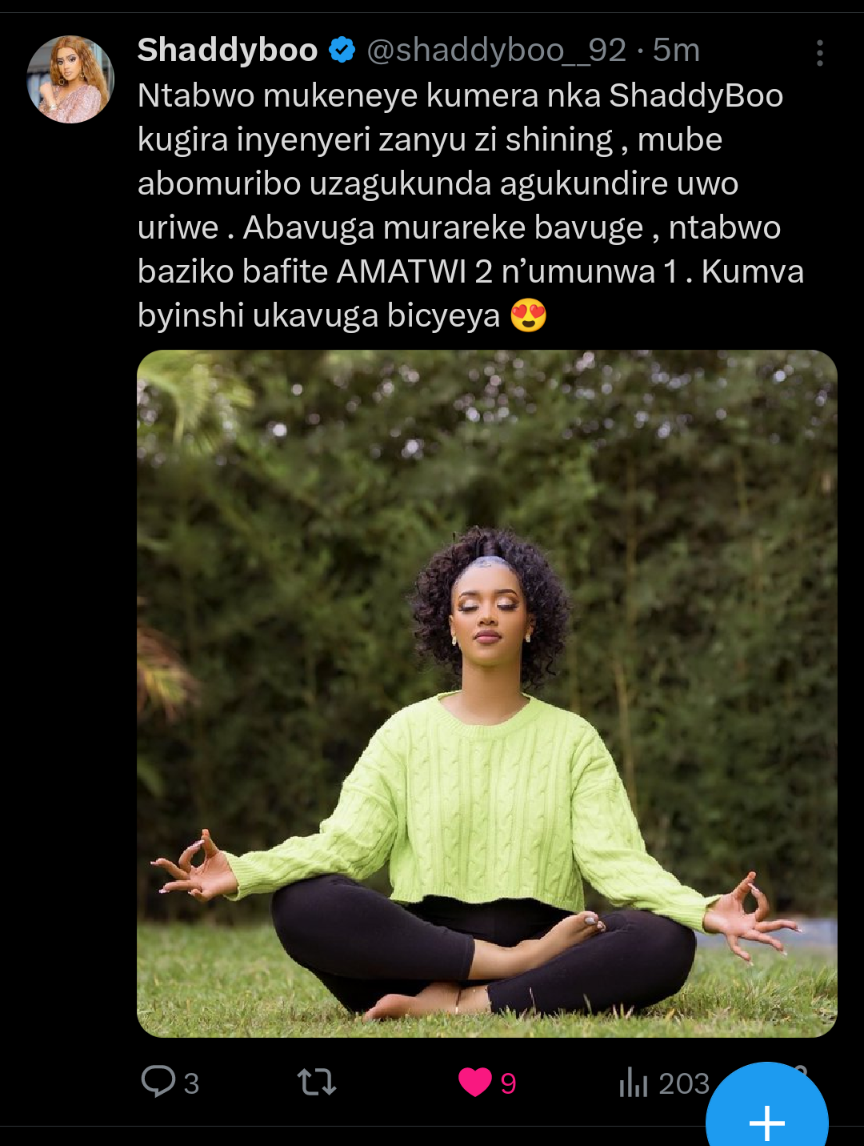 Umunyamideli Mbabazi Shadia uzwi ku izina rya Shaddy Boo yifashishije imbuga nkoranyambaga ze yasangije abakunzi be amagambo akubiyemo ubutumwa butandukanye aho yavugaga ko abantu bakwiriye kuba abaribo aho kugira ngo bihindure abo ataribo ari nako agira abantu inama yo kumva byinshi bakavuga bicye.
