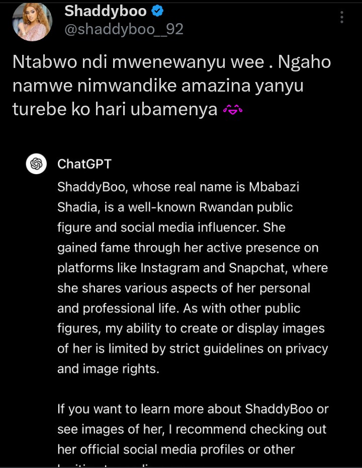 Abinyujije ku rukuta rwe rwa X, Mbabazi Shadia uzwi nka Shaddyboo yeretse abantu ko abarenze ho nyuma yo kwandika izina rye muri porogarame y’ikoranabuhanga ikamumenya ndetse igasobanuro uwo ariwe.