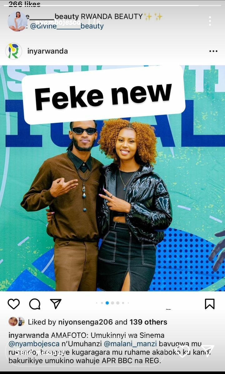 Gusa Nyambo abinyujije ku rukuta rwe rwa Instagram yifashije story, yahanye yivuye inyuma ko atari mu rukundo nuriya musore. Yavuze ko amakuru ari kuvugwa ko ari mu rukundo ari fake atari byo.