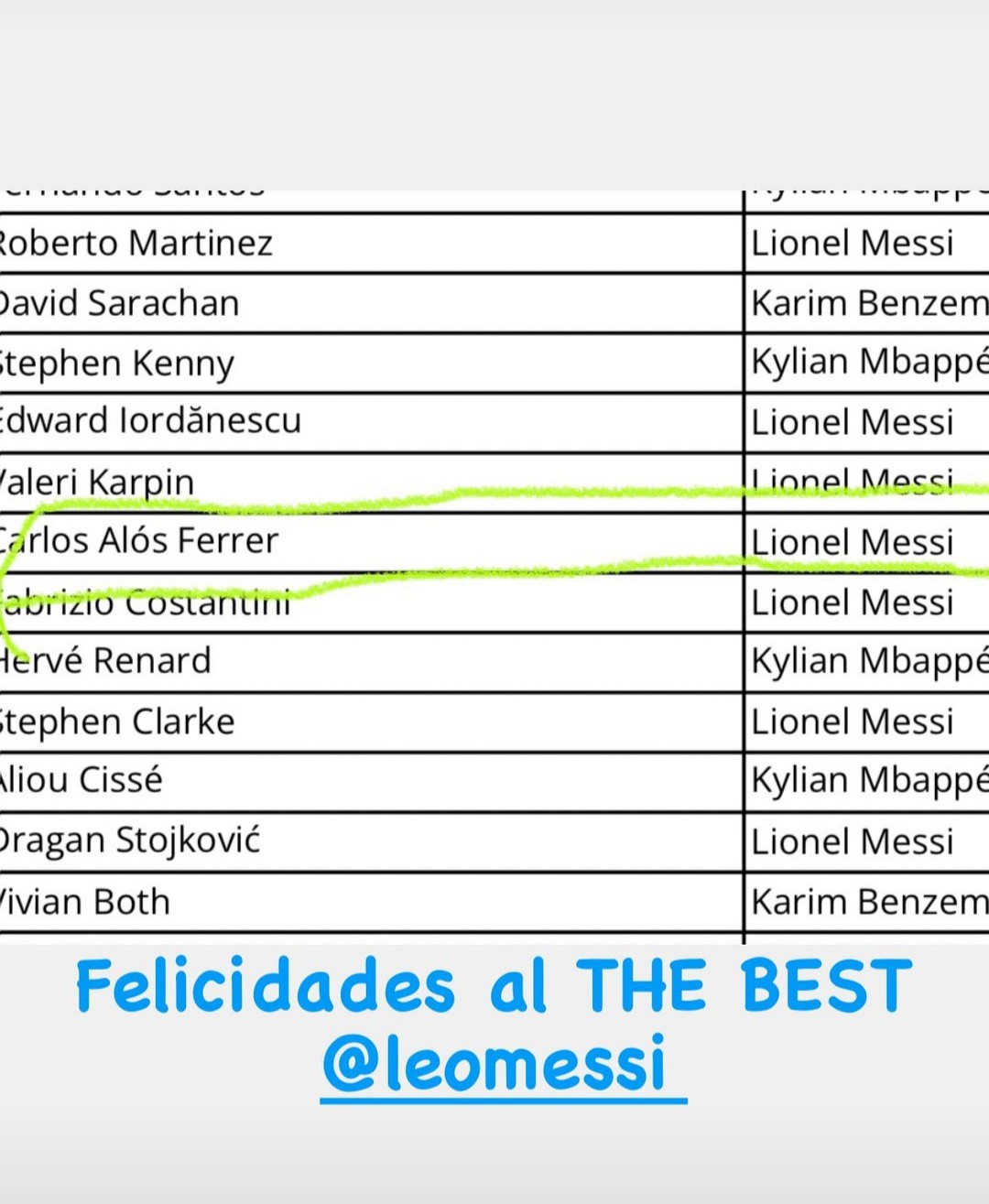 Umutoza w’ikipe y’igihugu Amavubi, Carlos Alos Ferrer yatoye Lionel Messi nk’umukinnyi witwaye neza mu mwaka ushize.