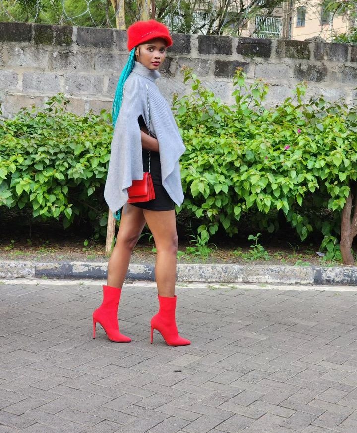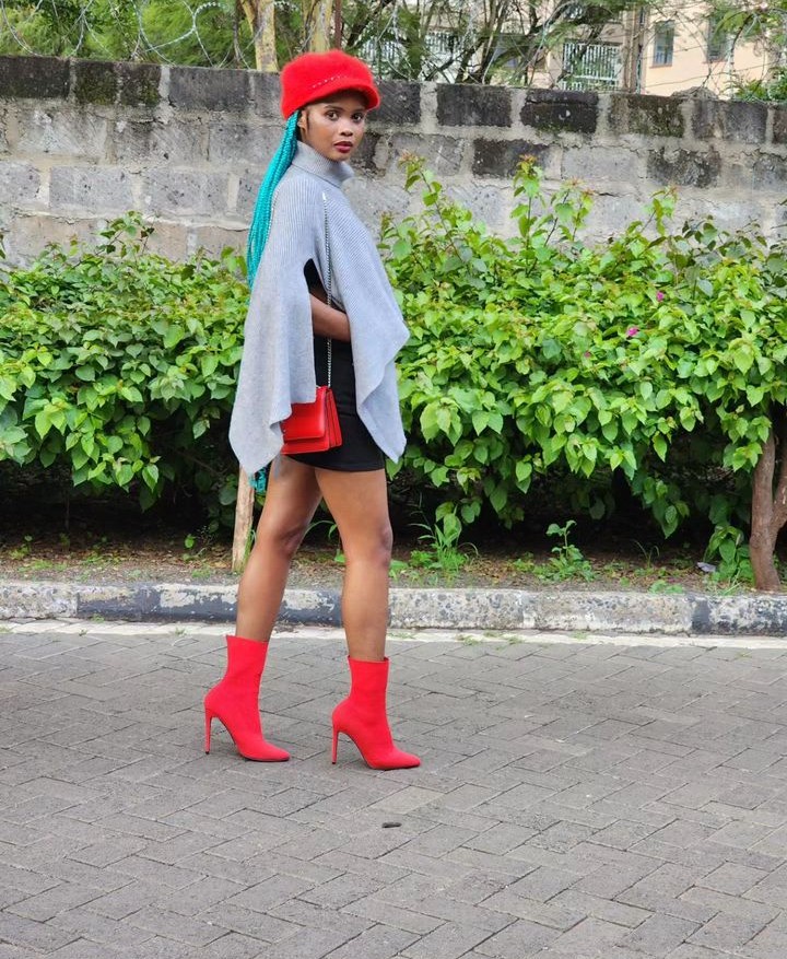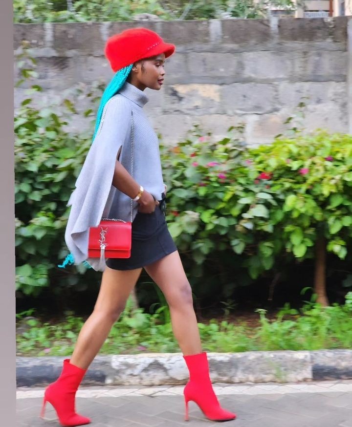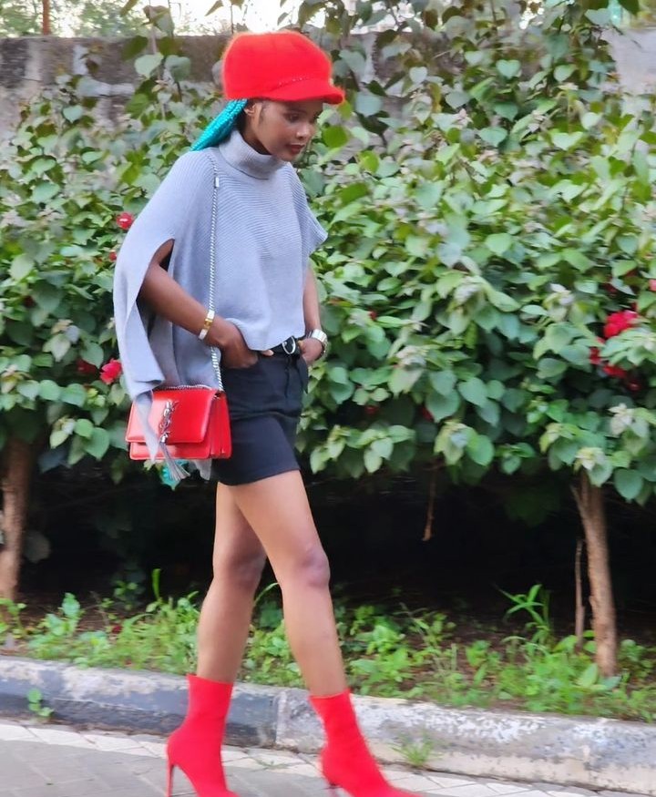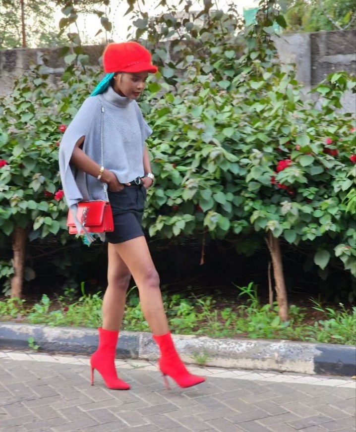 Mu mafoto ye yambaye inkweto ndende ndetse nagakabutura ka gufi kagaragaza ibibero bye nibwo buryo yiyerekanye mo.