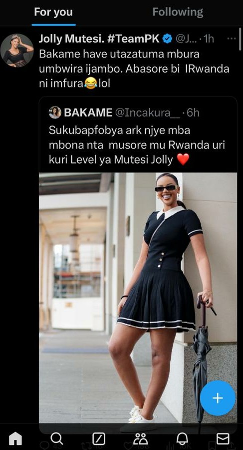 Uwitwa BAKAME kuruta rwa X yagize at “Si ukubapfobya gusa mbona nta musore wo mu Rwanda uri ku rwego rwa Jolly”. Ibi byatangaje Mutesi Jolly cyane ndetse bimutera kumusubiza.