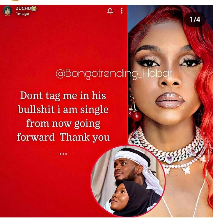 Zuchu wavuzwe mu rukundo na Diamond Platnumz akaba na sebuja mu nzu itunganya umuziki ya Wasafi Record, yagiye ku rubuga rwe rwa Instagram maze arandika ati “Ntimukanzaneho iby’umwanda we. Nta mukunzi mfite kuva ubu. Murakoze.”- Ubu butumwa Zuchu yabwanditse mbere y’uko asiba amafoto yose ari kumwe na Diamond.