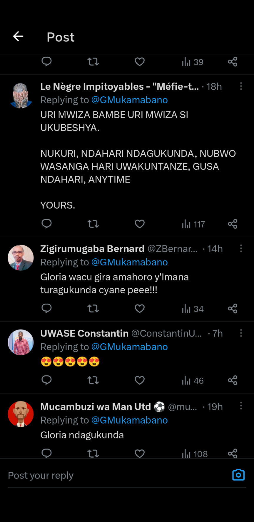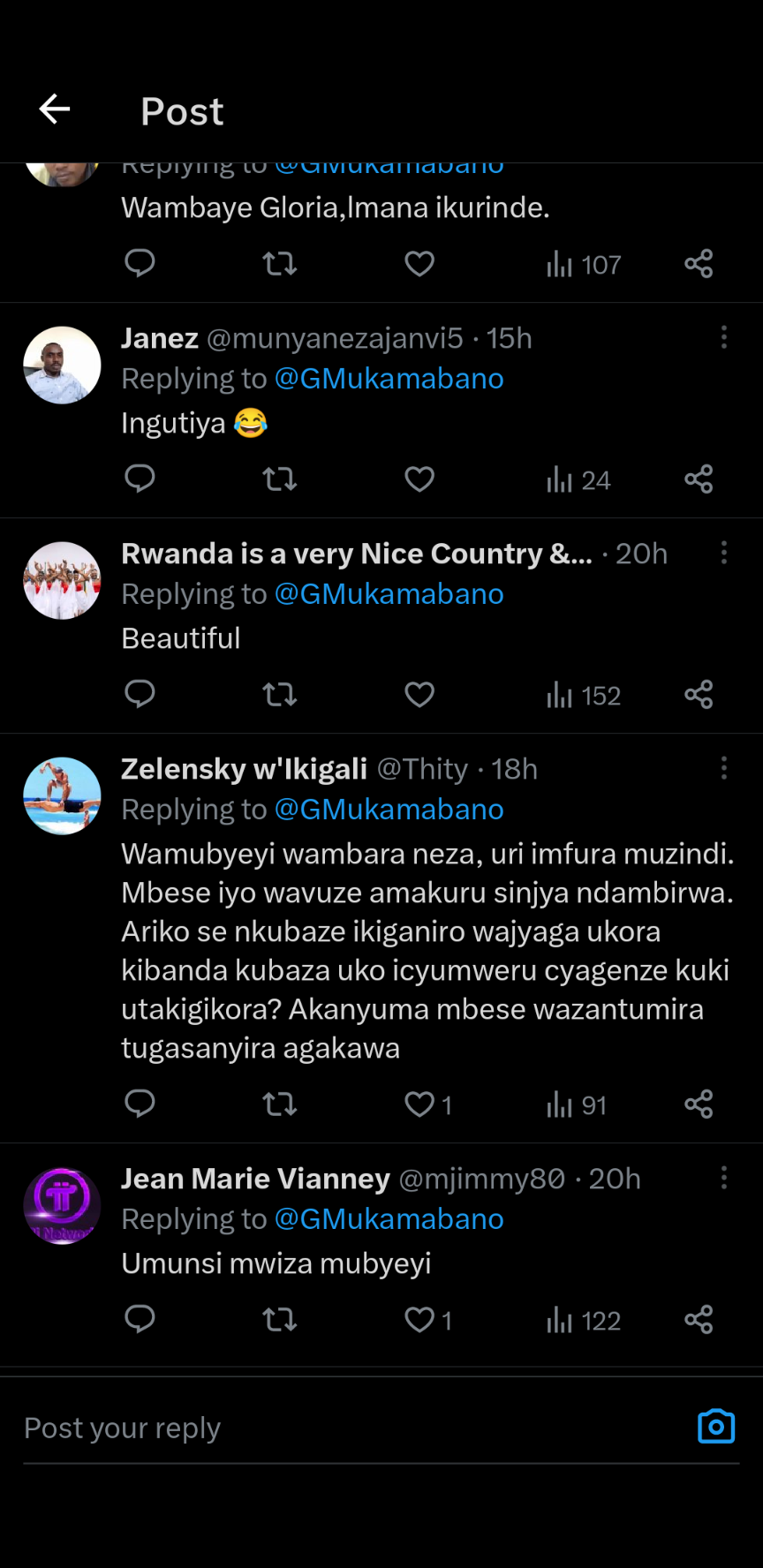 Umunyamakurukazi Gloria Mukamabano ukorera televiziyo y’Igihugu yifashishije urubuga nkoranyambaga rwe rwa X yashyizeho ifoto ye nziza cyane igaragagaza uburanga bwe maze abamukurikira kuri urwo rubuga batangira ku mwereka urukundo bamukunda batizigamye.