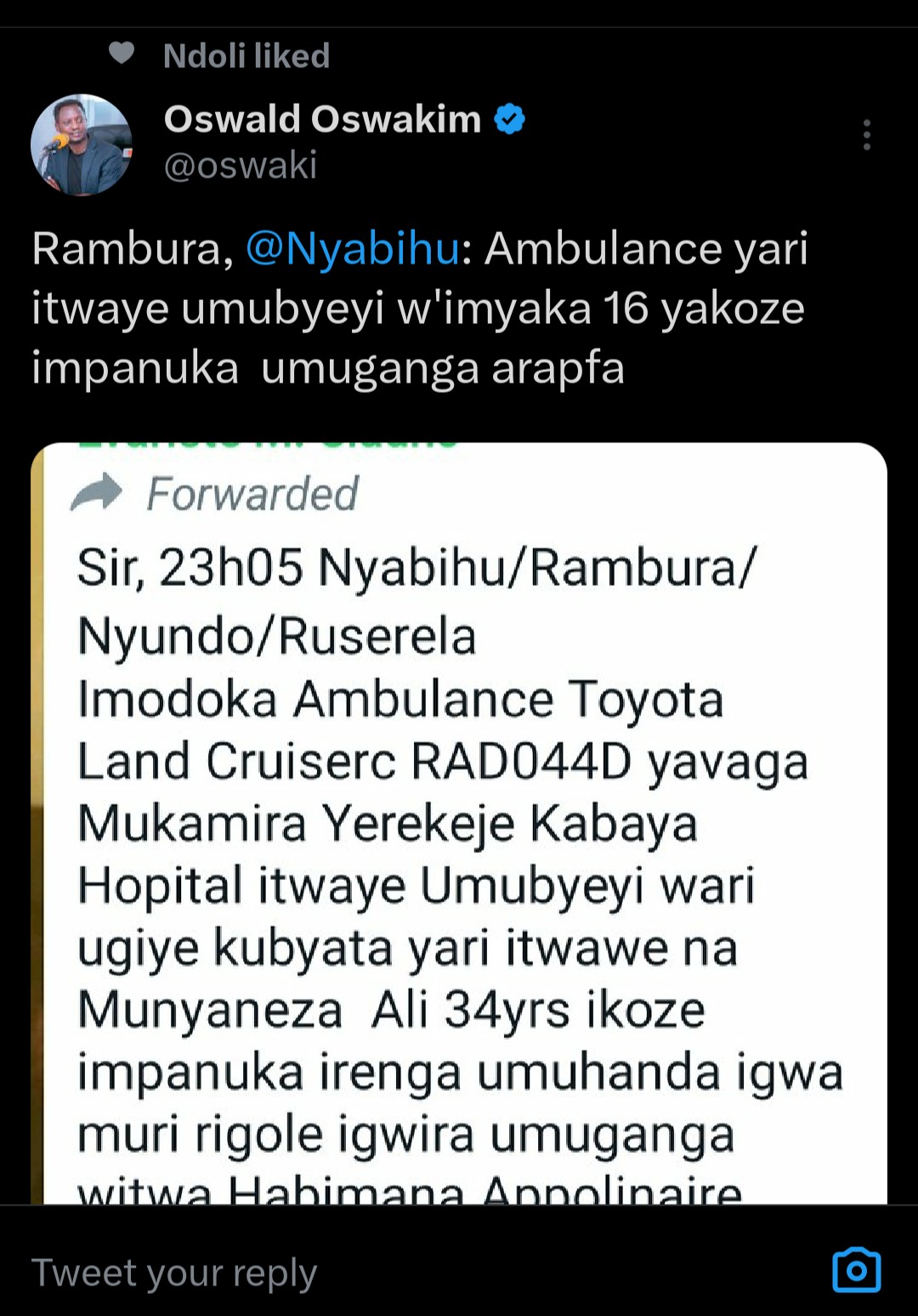 Mu makuru y’ibanze yatangajwe ku rukuta rwa X kuri konti ya Oswald, iyi ambulance yari ijyanye uyu mubyeyi kwa muganga kugira ngo yibaruke.