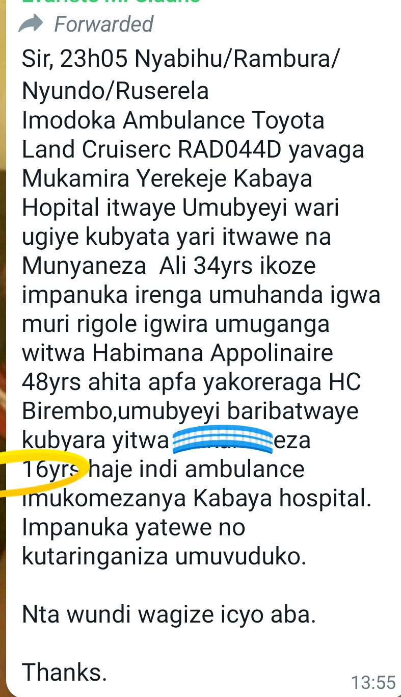 Ibi byabereye Rambura mu karere ka Nyabihu aho imbangukiragutabara yari itwaye umubyeyi w’imyaka 16 yakoze impanuka umuganga arapfa.