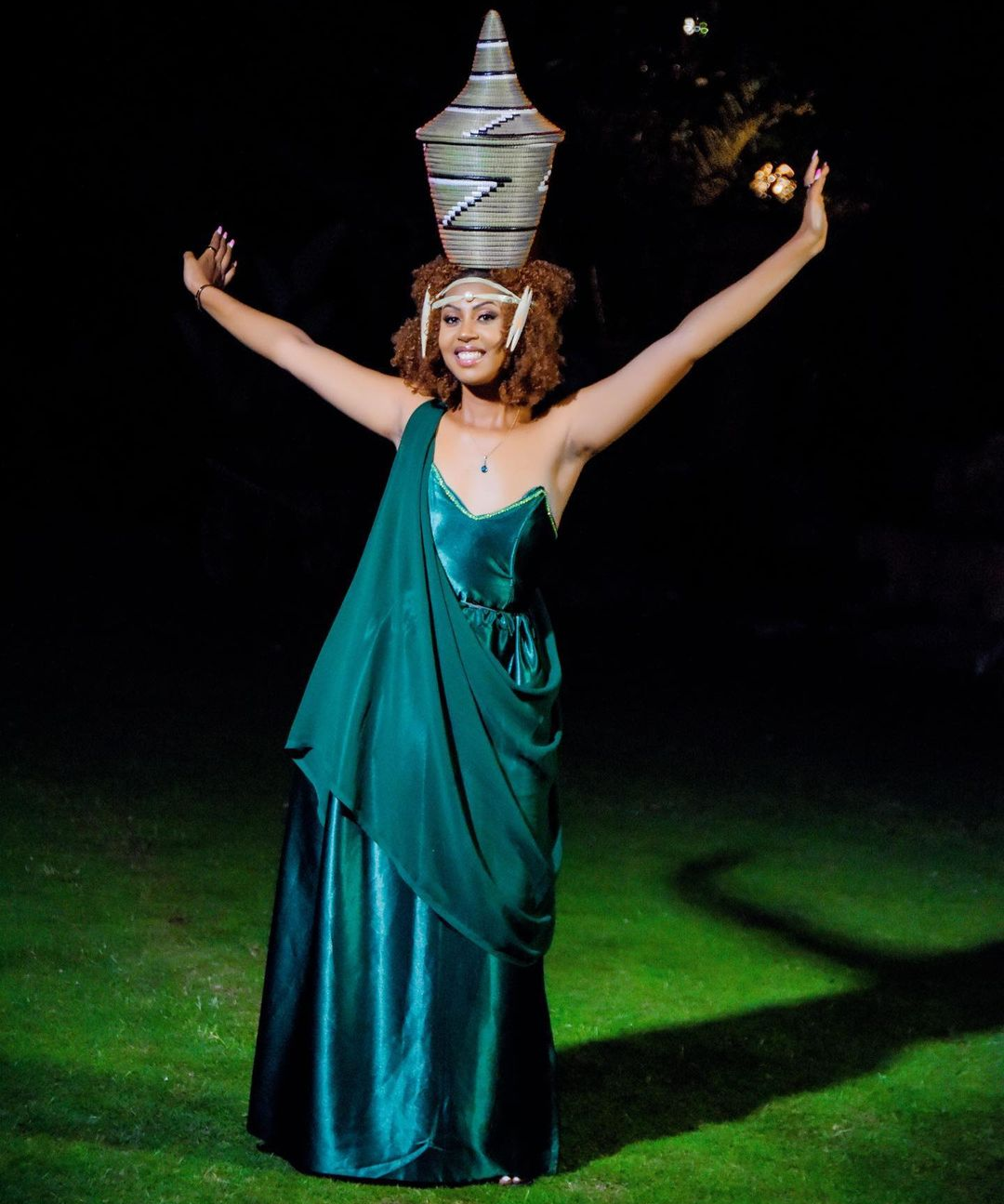 Abinyujije kurukuta rwe rwa Instagram yashyizeho amafoto yambaye imyambaro ya kinyarwanda imikenyero afite igisabo mu ntoki ndetsa anikore ikibo bimwe mu bikoresho byakoreshwaga mu bihe byo hambere.