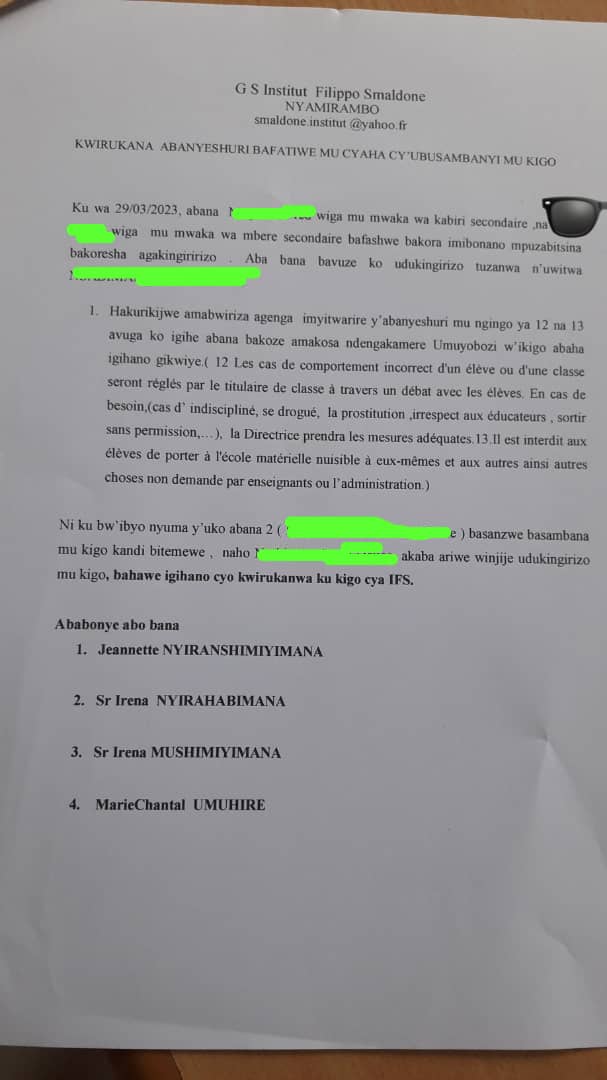 Mu murenge wa Nyamirambo, akarere ka Nyarugenge, mu kigo cy’abihayimana (Ababikira) Kiri ahitwa (L.P ) cyitwa Institut Pilippo Smaldone haravugwamo ubusambanyi n’urugomo.