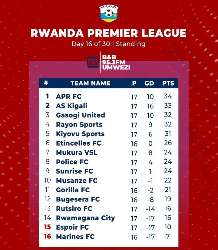 Nyamukandagiramukibuga yafashe umwanya wa mbere! Dore uko urutonde rwa shampiyona ruhagaze nyuma y’umunsi wa 17