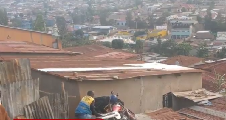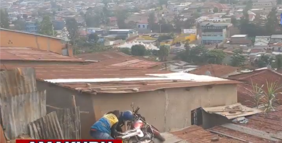 Nyarugenge! Umumotari wari uhetse umugenzi moto yabuze feri ibarenza umuhanda igwa hejuru y’inzu y’umuturage -AMAFOTO
