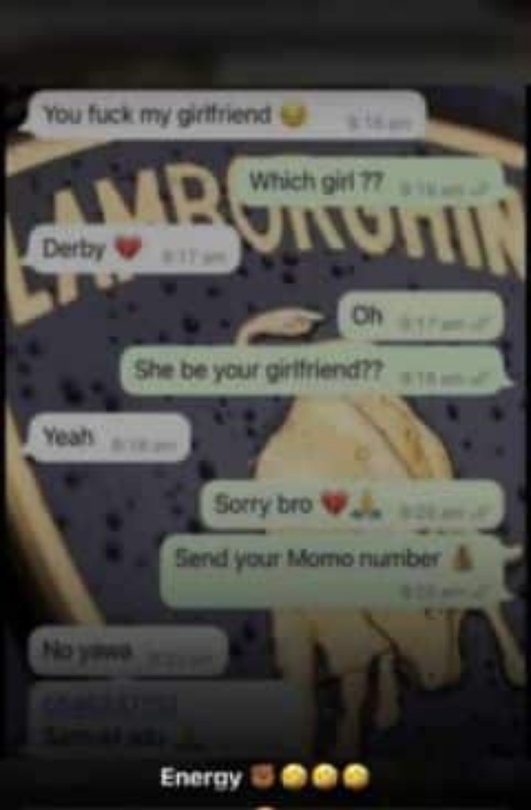 Nk’uko bigaragara mu butumwa aba bombi bandikiranye kuri Whatsapp umukunzi w’umukobwa wasamanyijwe n’uyu musore yaramwandikiye amubwira ko yababajwe cyane no kuba uyu musore yararyamaye n’umukobwa bakundana.Nyuma yo kumva ko ibye bigiye hanze yahise amwaka numero ye kugirango amwoherereze amafaranga byihuse kugirango amubabarire.