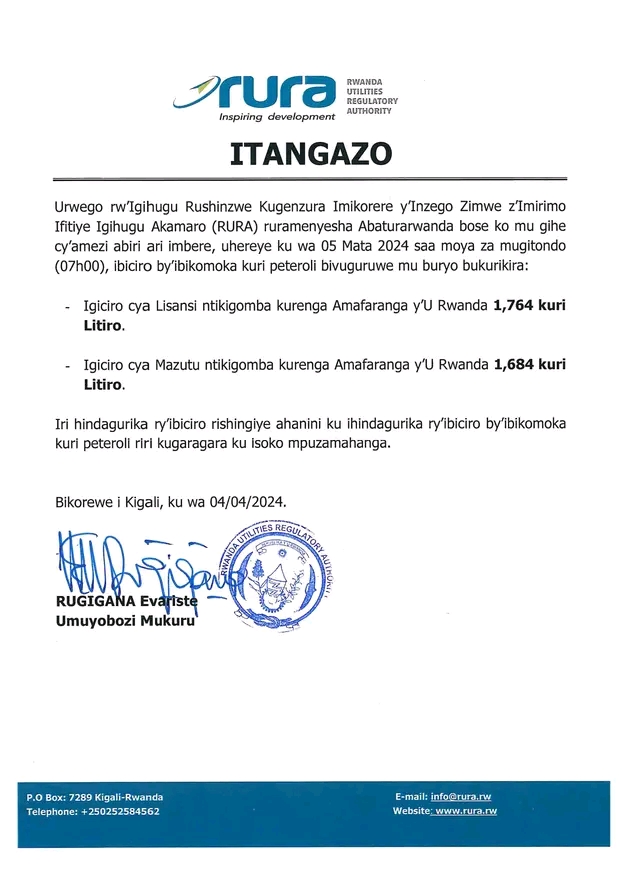 Urwego Ngenzuramikorere, RURA, rwatangaje ko igiciro gishya cya lisansi cyiyongereyeho 127 Frw kuri litiro, kigera kuri 1,764 Frw, mu gihe icya mazutu cyiyongereyeho 52 Frw, kigera kuri 1,684Frw.