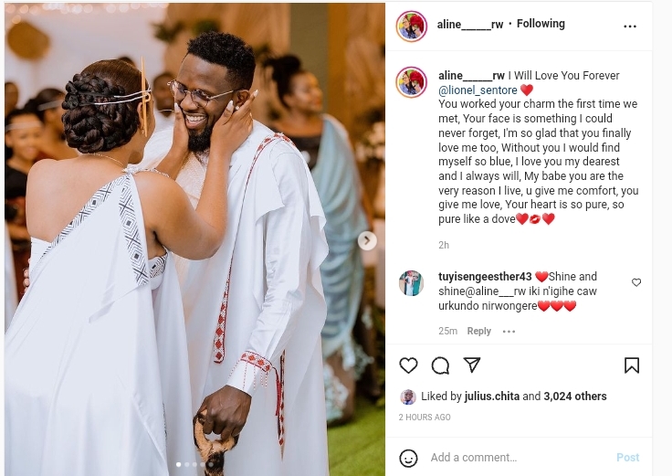Bijoux yagize ati:”Nzagukunda ubuziraherezo,Lionel Sentore.Nakugizeho igikundiro kuva umunsi wa mbere duhura.Isura yawe nikintu ntashobora kwibagirwa, Biranezeza cyane ko byarangiye nawe unkunda, ntari kumwe na we sinzi icyo naba ndicyo.Ndagukunda cyane mukundwa kandi nzahora ngukunda, Mukunzi wanjye ndiho kubera wowe, umpa ihumure, umpa urukundo, Umutima wawe urasukuye cyane, wera nkinuma”.