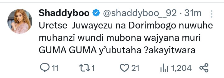 Abinyujije ku rukuta rwe rwa X, Shaddy Boo yagize ati “Uretse Juwayezu na Dorimbogo nuwuhe muhanzi wundi mubona wajyana muri GUMA GUMA y’ubutaha? akayitwara?”