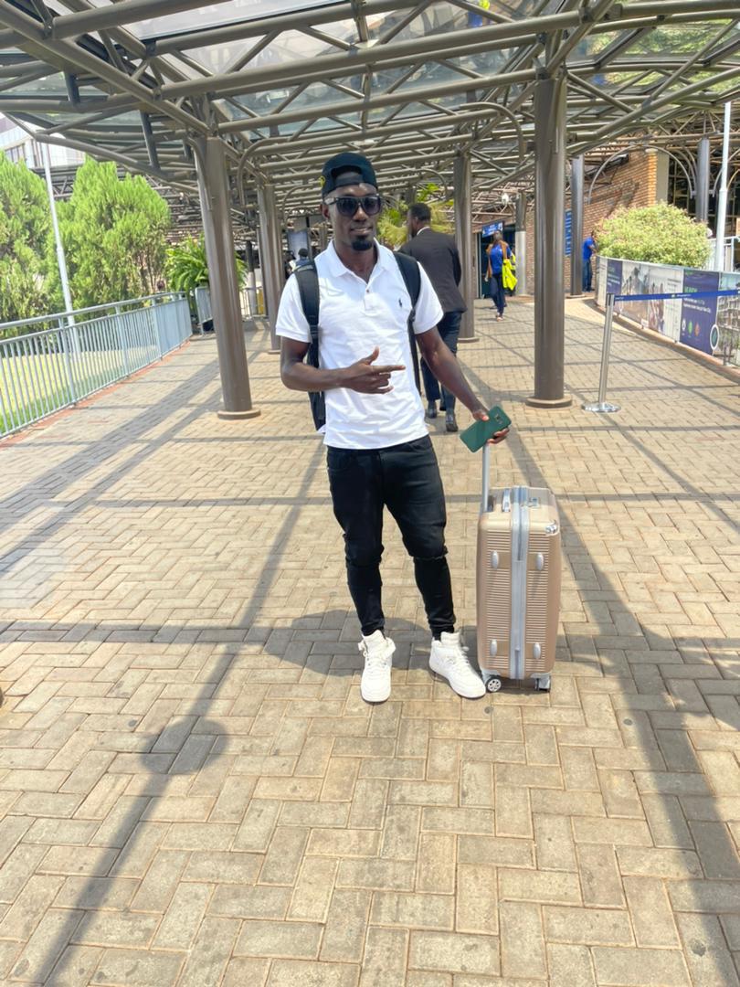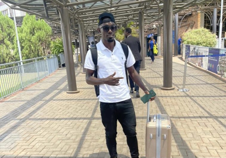 Umugande Erisa Ssekisambu ,umukinnyi mushya wa Kiyovu Sports ageze ku kibuga cy’indege mpuzamahanga cya Kigali i Kanombe aje gufatanya na bagenzi kwitegura umwaka w’imikino wa 2022-23.