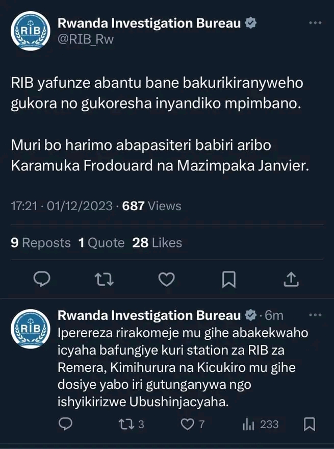 Iperereza rirakomeje mu gihe abakekwaho icyaha bafungiye kuri station za RIB za Remera, Kimihurura na Kicukiro mu gihe dosiye yabo iri gutunganywa ngo ishyikirizwe Ubushinjacyaha.