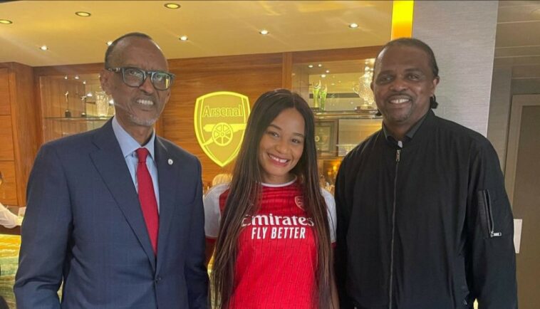 Perezida Kagame yagaragaye ari kumwe na Nwankwo Kanu wakiniye Arsenal kuva 1999 kugeza mu 2004 n’umugore we Amara Kanu.