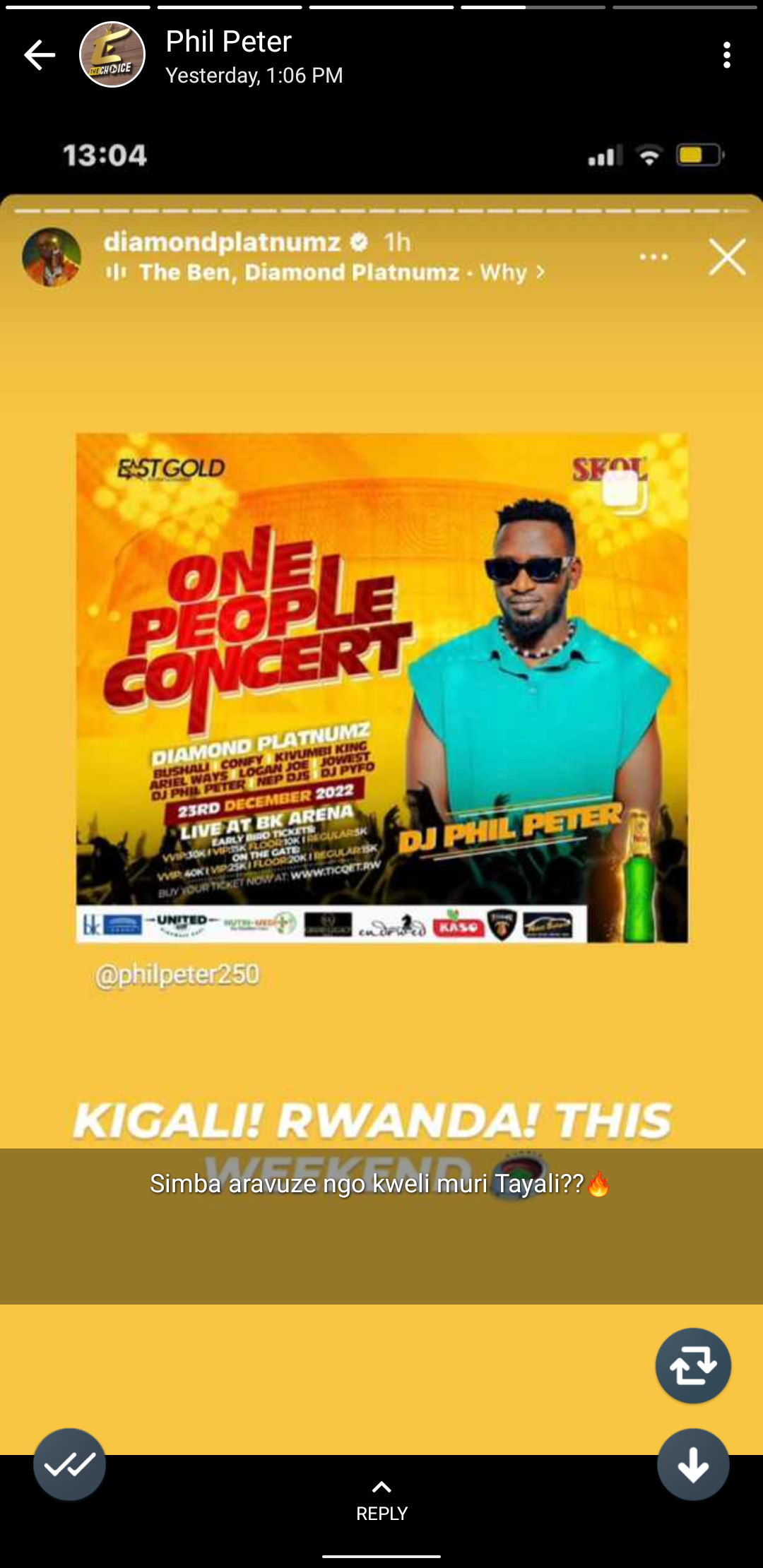 Ku munsi wejo nibwo umuhanzi w’icyamamare muri Africa ukomoka muri Tanzania Diamond Platinumz yasangije abamukurikira ifoto ya Phil Peter avuga ko ari tayari gutaramira mu Rwanda.
