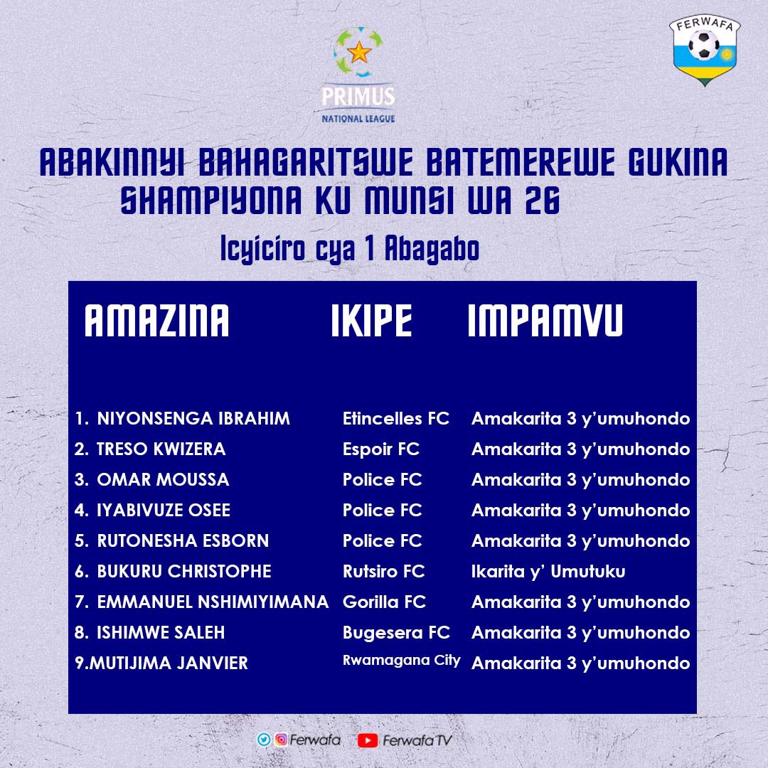Urutonde rw’abakinnyi 9 batemerewe gukina umunsi wa 26: