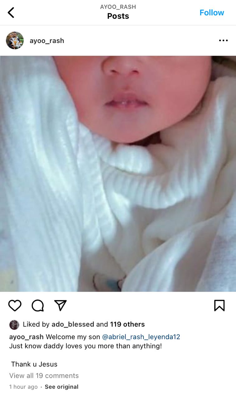 Ayoo Rash abinyujije ku rubuga rwe rwa instagram yagize ati:” Urakaze neza muhungu wanjye Abriel Rush Leyenda umenye ko So ngukunda kurusha icyo aricyo cyose“.