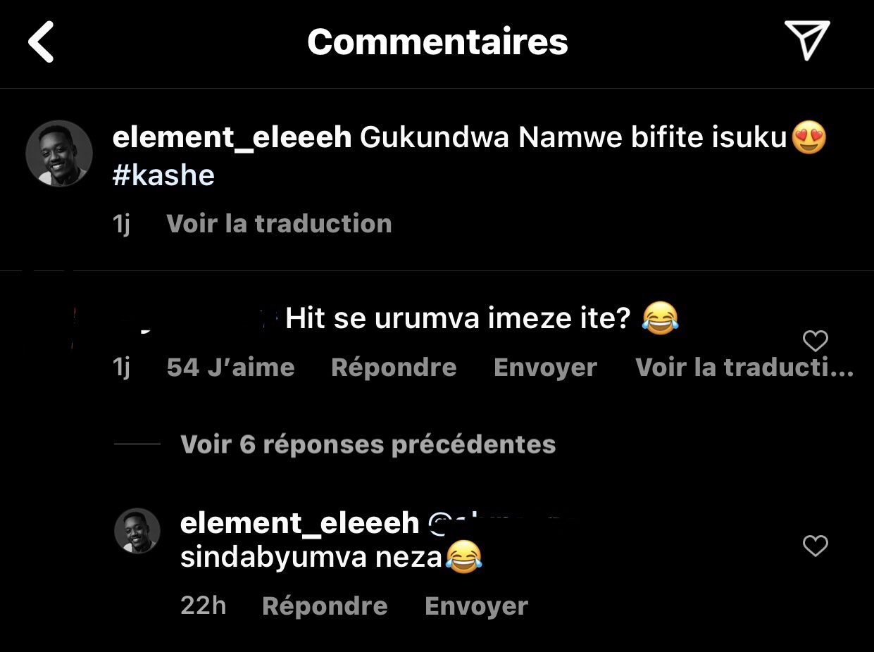 Ku munsi w’ejo ubwo Eleeeh yashyiraga kuri instagram kamwe mu gace k’amashusho kagaragara mu ndirimbo Kashe yibutsa abafana be kuyireba, umwe mu bafana be yamubajije uko hit imera. Umufana yagize ati « Hit se urumva imeze ite? 😂 ». Eleeeh yahise amusubiza mu magambo agira ati « sindabyumva neza😂 ».