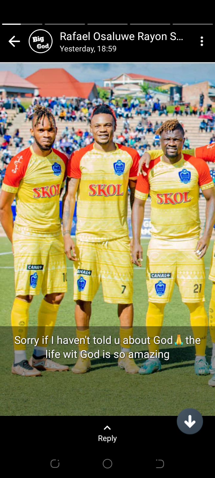 Mu butumwa uyu musore yanyujije kuri status ye ya Whatsapp yakurikije ifoto yashyizeho irimo Hertier Luvumbu ndetse na Leandre Willy Essomba Onana ari kumwe nabo yagize Ati ” Mu mbabarire niba ntarabibabwiye iby’Imana🙏 ariko ubuzima burimo imana buratangaje cyane!”