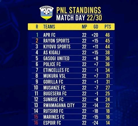 Uko urutonde rwa shampiyona by’agateganyo ruhagaze: