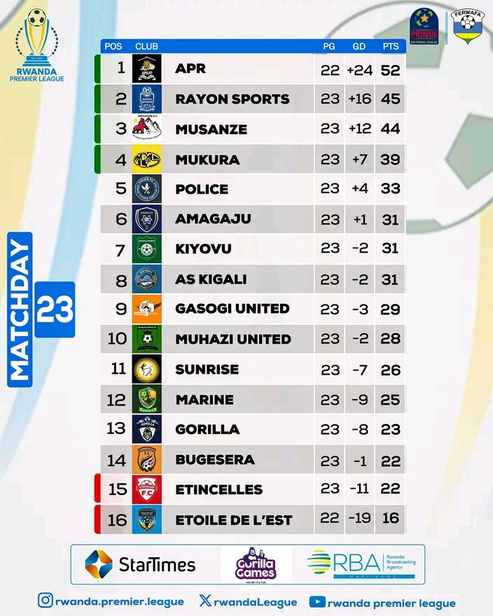 Shampiyona y’Icyiciro cya mbere mu mupira w’amaguru mu Rwanda ‘Rwanda Premier League’ igeze ku munsi wa 23 wayo, dore uko rutonde ruhagaze.