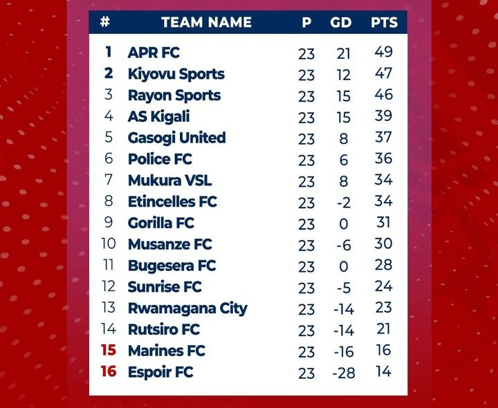 APR FC ikomeza kuyobora uru rutonde n’amanota 49, ikurikirwa na Kiyovu Sports ifite amanota 47.