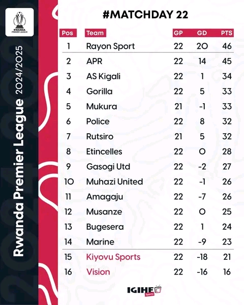 Nyuma y’imikino yose y’Umunsi wa 22 wa Shampiyona y’u Rwanda, Rayon Sports ni yo iyoboye urutonde n’amanota 46, ikurikirwa na APR FC ifite amanota 45. AS Kigali iri ku mwanya wa gatatu n’amanota 34, inganya na Gorilla FC iri ku mwanya wa kane ariko ikaba ifite umwenda w’ibitego biri hejuru.