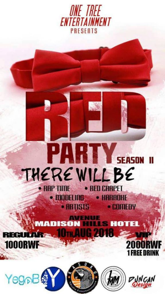 RED PARTY ni igitaramo ngaruka mwaka kikaba kigiye kuba ku nshuro ya 2, aho kuri iyi nshuro cyateguwe na ONE TREE ENTERTAINMENT. Muri iki gitaramo kitiriwe izina rya RED PARTY, MC/Artist SONGABOY azaba ariwe mushyushyarugamba. RED PARTY Season II isanzwe imenyerewe nka show ya Dress Code ku bijyanye n’ ibara ryumutuku ndetse ni igitaramo gihuza abantu bingeri zose bakishimana n’abahanzi benshi batandukanye, abanyamideli, abaphotographes, ababyinnyi kabuhariwe ndetse n’aba DJs b’abahanga.