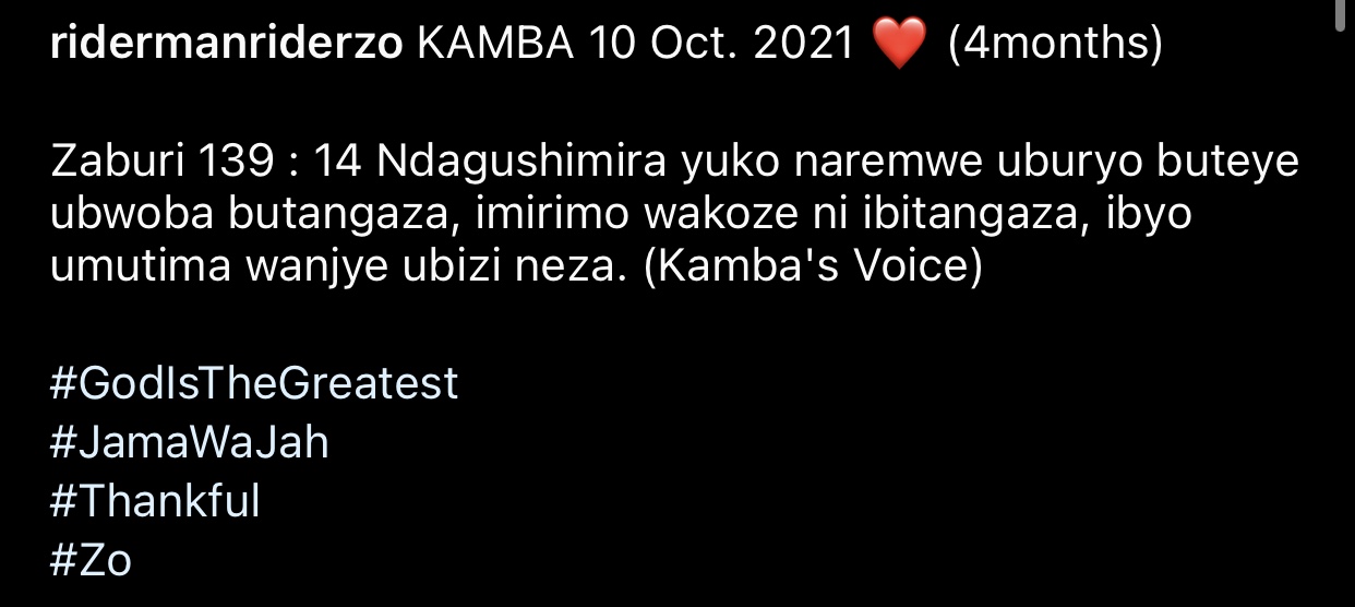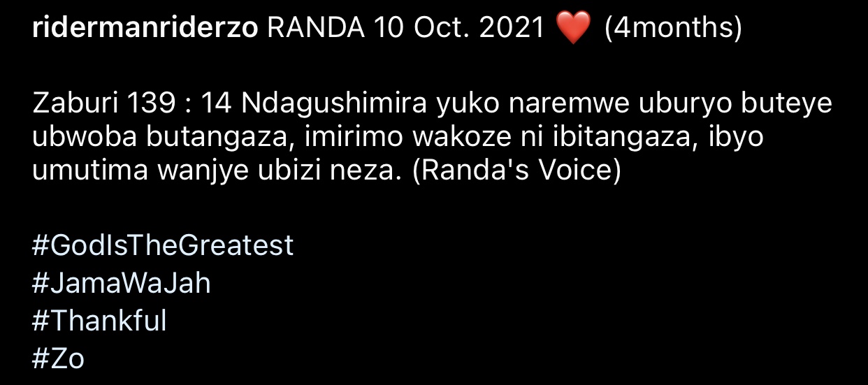 Riderman abinyujije ku rukuta rwe rwa instagram yavuze amagambo akomeye ku bana be babiri b’impanga ariko Kamba na Randa. Ni nyuma yuko aba babiri bari bamaze amezi ane babonye izuba kuko babonye izuba ku ya 13 Kamena 2021.