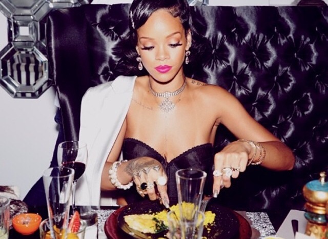 Rihanna avuga ko mu modoka ye, akenshi atwaramo ibyo kurya no kunywa birimo; Snacks, umuvinnyo utukura cyangwa uw’umweru. Ibiryo akunda bya mbere ni umuceri n’amashaza. Iyo amaze kurya kandi arenzaho ikinyobwa gisindisha cya ‘vodka’ (Umuvinyo ukarishye cyane) cyangwa ‘cocktail’. Gusa uyu muhanzikazi avuga ko akunda byinshi birimo; imboga rwatsi, amakaroni, inyama, capati n’ibindi