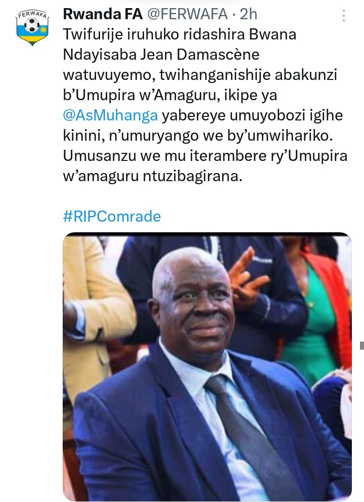 FERWAFA yagize iti “Twifurije iruhuko ridashira Bwana Ndayisaba Jean Damascène watuvuyemo, twihanganishije abakunzi b’Umupira w’Amaguru, ikipe ya As Muhanga FC yabereye umuyobozi igihe kinini, n’umuryango we by’umwihariko. Umusanzu we mu iterambere ry’Umupira w’amaguru ntuzibagirana.”