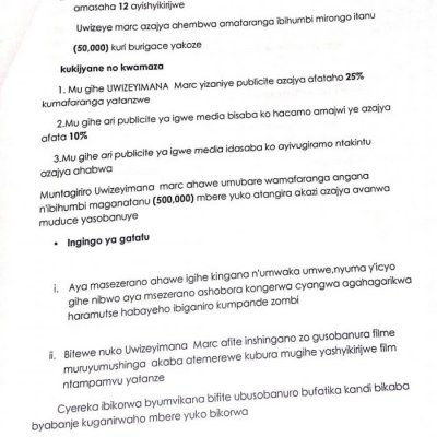 Nk’uko bigaragara mu masezerano bagiranye, ni uko buri gace Rocky Kimomo yari kujya asobanura, yagombaga kujya ahabwa ibihumbi 50Frw akagenda avanwa muri bya bihumbi 500 Frw yahawe ku ikubitiro, ari nako bagenda bamwongera andi bijyanye n’aho umushinga wari kuba ugeze.
