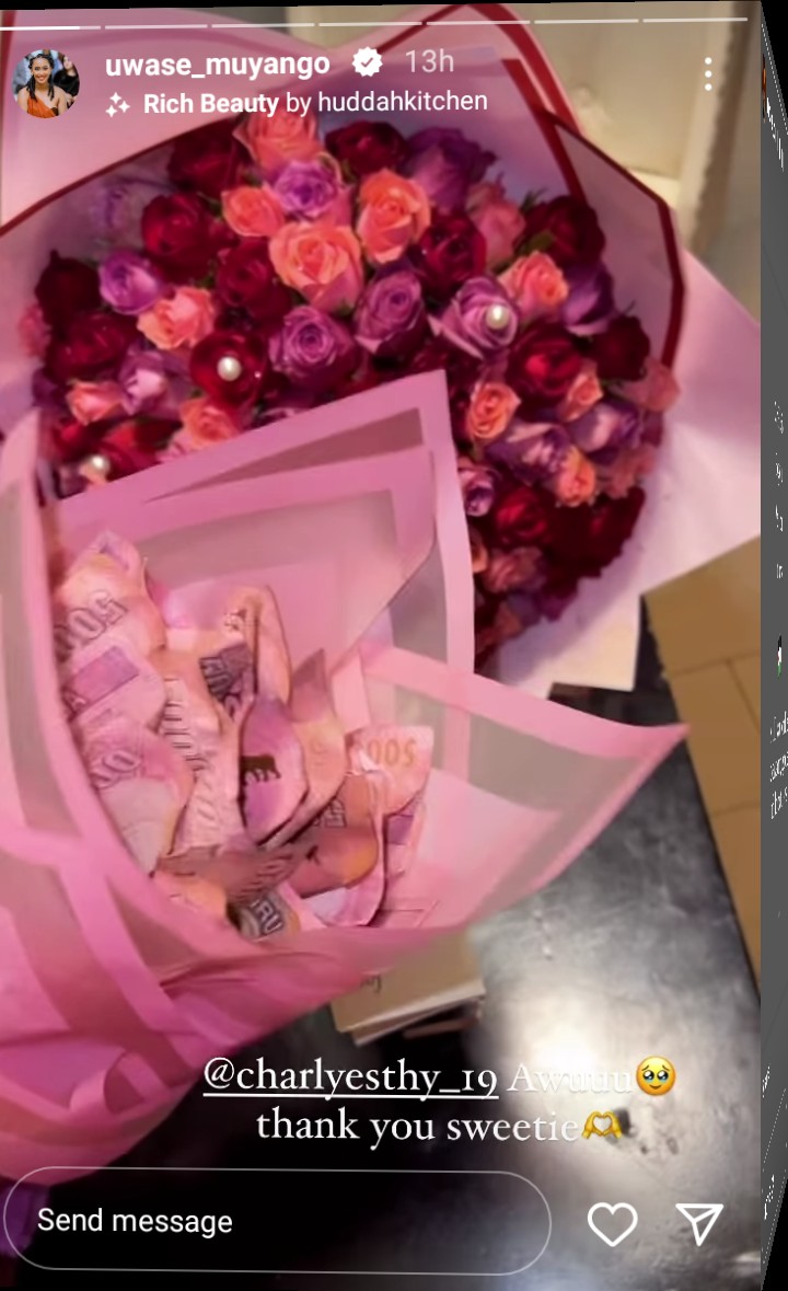 Mu mashusho magufi Muyango yasangije abamukurikira ku rukuta rwe rwa Instagram, yerekanye ururabyo rugizwe n’inoti za 5000FRW, maze ashimira uwitwa Rudasingwa Charly Esthy bishoboka ko ariwe warumuhaye.