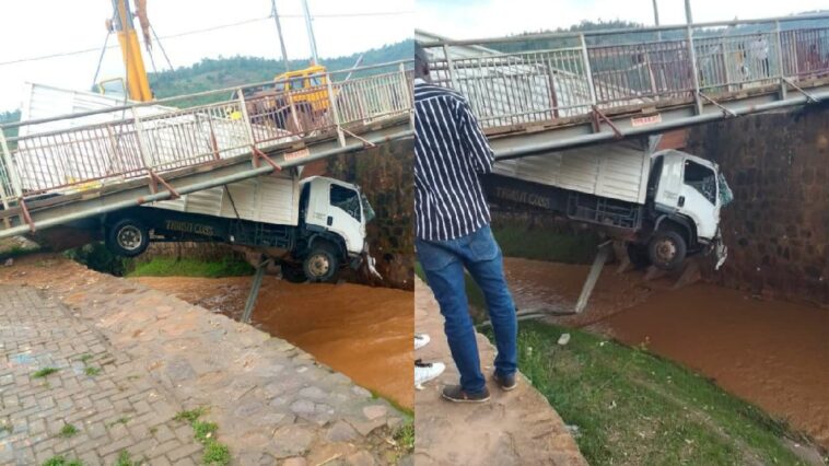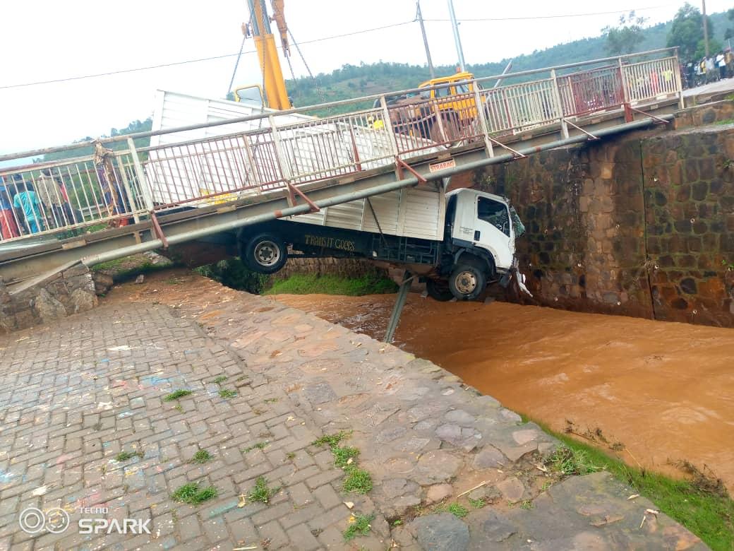 Iyi modoka yaje gukurwamo nyuma y’uko yari imazemo akanya inagana hejuru y’iko kiraro.