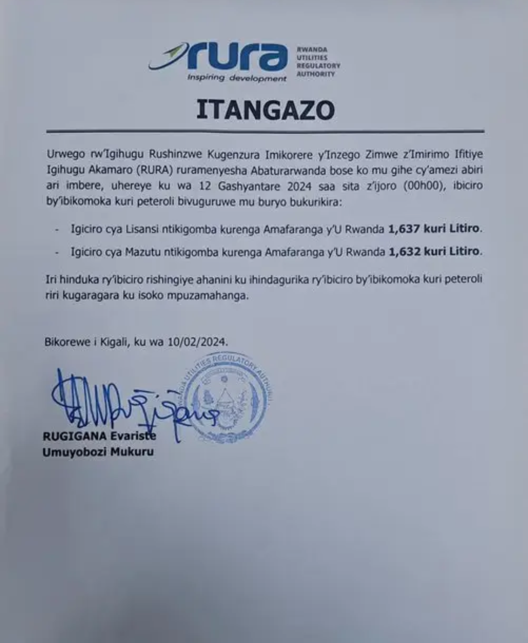 Kuri uyu wa Gatandatu tariki 10 Gashyantare 2024, Ikigo cy’igihugu gishinzwe kugenzura imikorere y’inzego zimwe z’imirimo ifitiye igihugu akamari RURA yatangaje ibiciro bishya by’ibikomoka kuri peteroli.