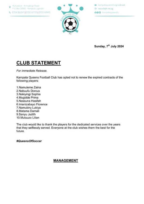 Mu itangazo Kampala Queen yanyujije ku mbuga nkoranyambaga zayo, yashyize hanze urutonde rw’abakinnyi 10 yatandukanye nabo harimo na Imanizabayo Florence.