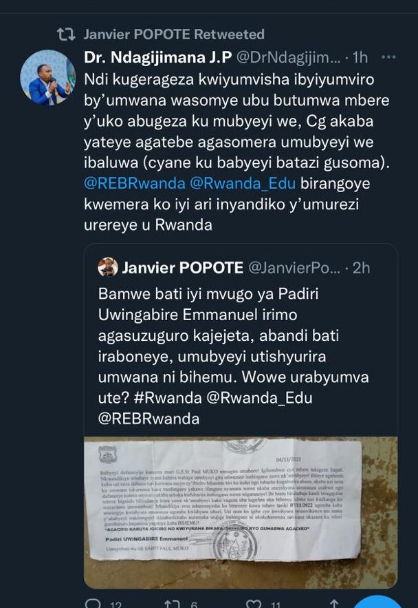 Ndi kugerageza kwiyumvisha ibyiyumviro by’umwana wasomye ubu butumwa mbere y’uko abugeza ku mubyeyi we, Cg akaba yateye agatebe agasomera umubyeyi we ibaluwa (cyane ku babyeyi batazi gusoma). @REBRwanda @Rwanda_Edu birangoye kwemera ko iyi ari inyandiko y’umurezi urereye u Rwanda https://t.co/C3jgsV5jbd