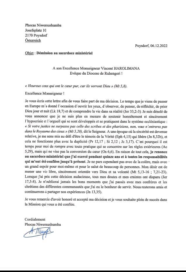Padiri Niwemushumba asanzwe aba muri Autriche aho yigaga muri Kaminuza ya Vienne, ari naho yandikiye ibaruwa y’ubwegure bwe tariki ya 6 Ukuboza 2022.